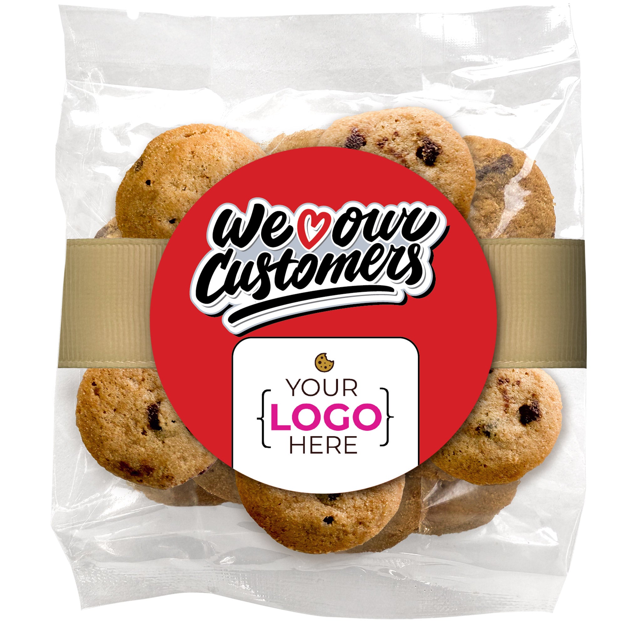 We Love our Customers Logo Upload - Bite-Sized Chocolate Chip Cookies (2 oz., approx. 14 cookies) W/ Full Color Custom Sticker & Ribbon
