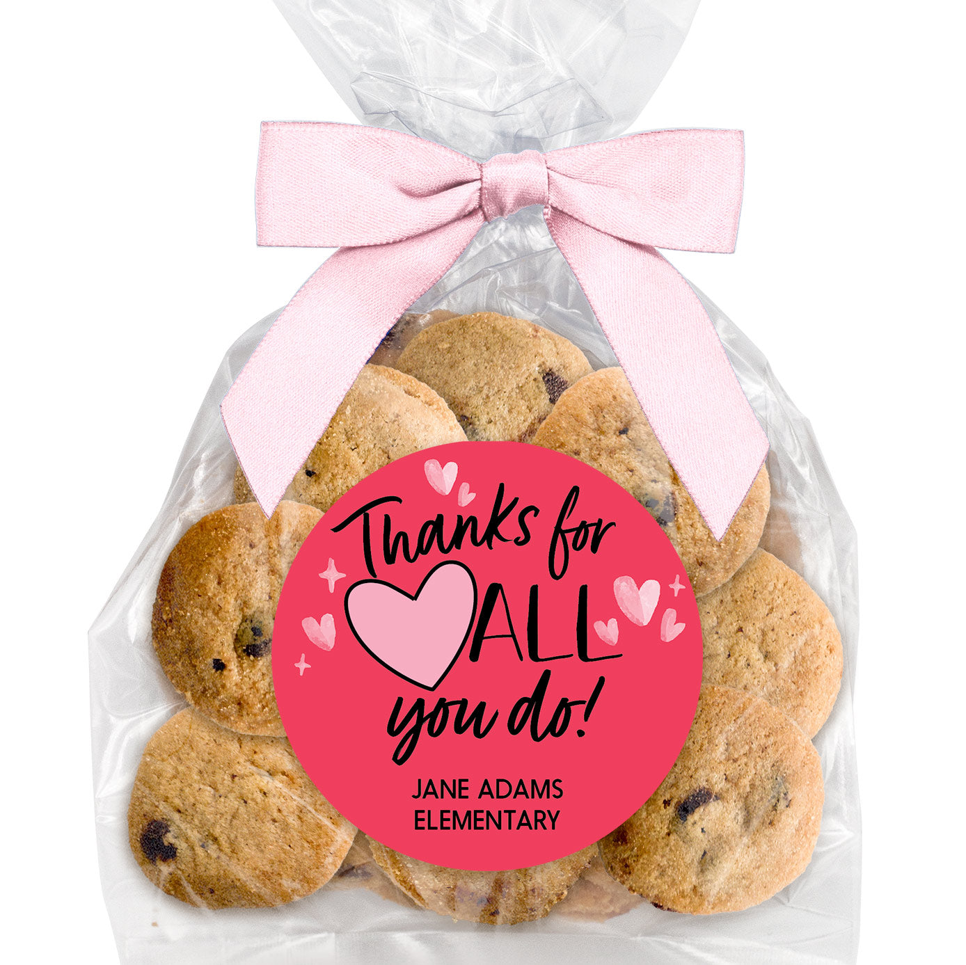 Thanks for all you do Valentines - Bite-Sized Chocolate Chip Cookies (2 oz., approx. 14 cookies) W/ Full Color Custom Sticker & Ribbon