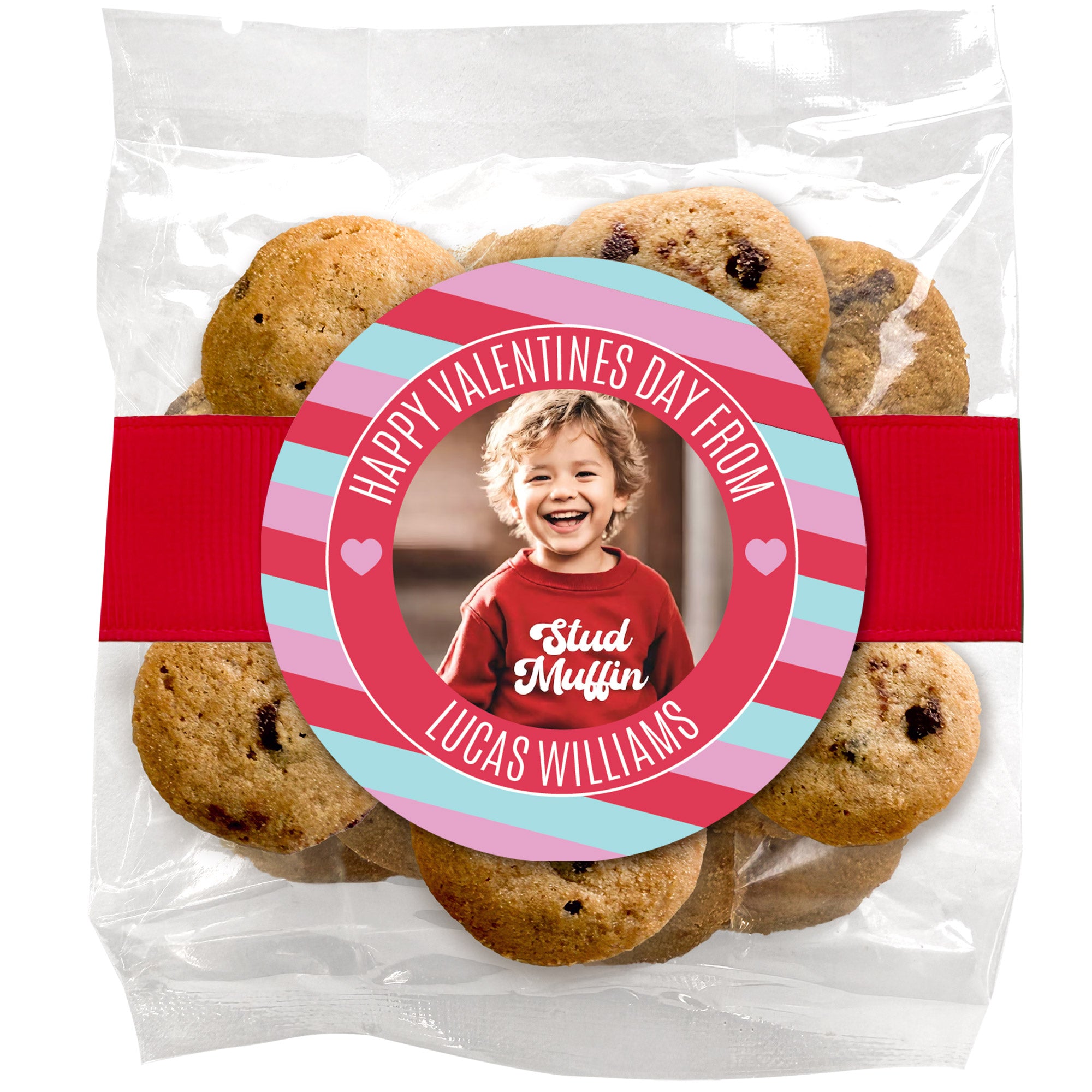 Happy Valentines Day Photo and Name Stripes - Bite-Sized Chocolate Chip Cookies (2 oz., approx. 14 cookies) W/ Full Color Custom Sticker & Ribbon
