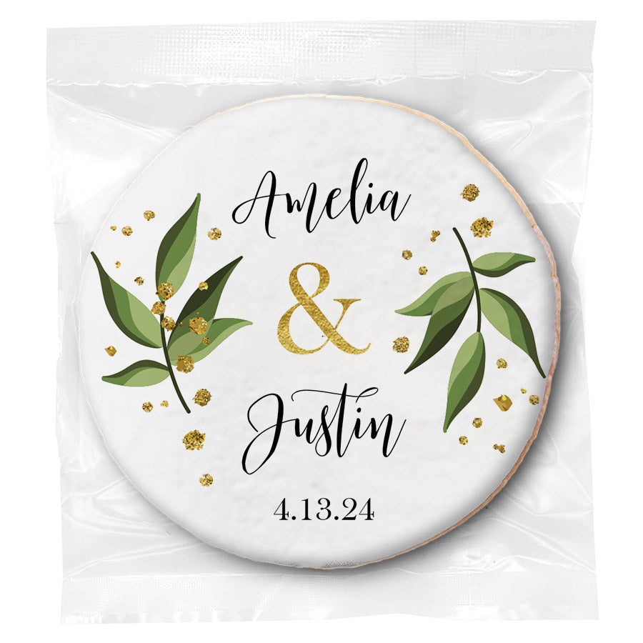 Personalized Wedding "Gold Speckled Leaves" - Direct Print on Round Sugar Cookies: Create a whimsical atmosphere at your wedding with our personalized cookies featuring gold speckled leaves design printed on round sugar cookies, perfect for nature-inspired weddings or outdoor celebrations.
