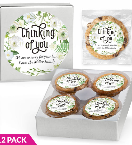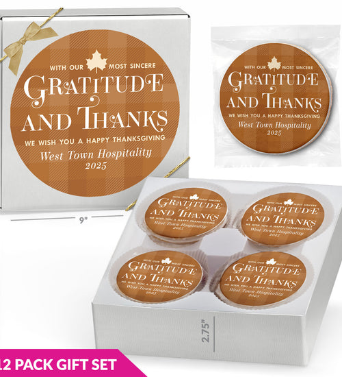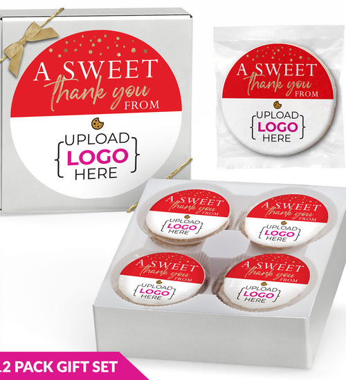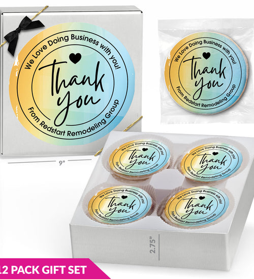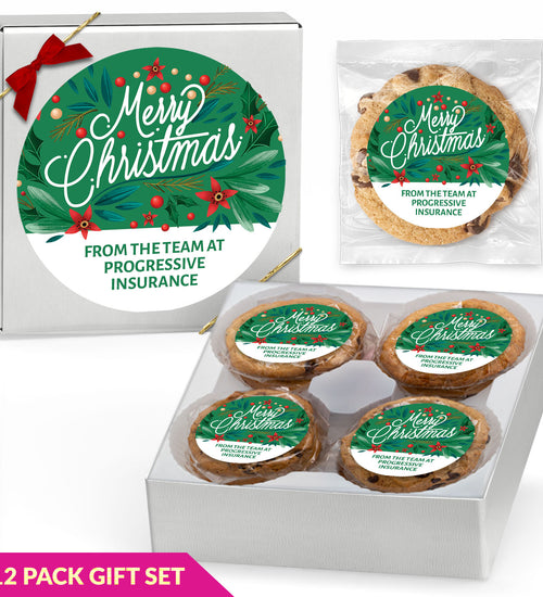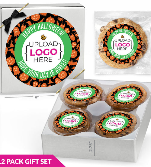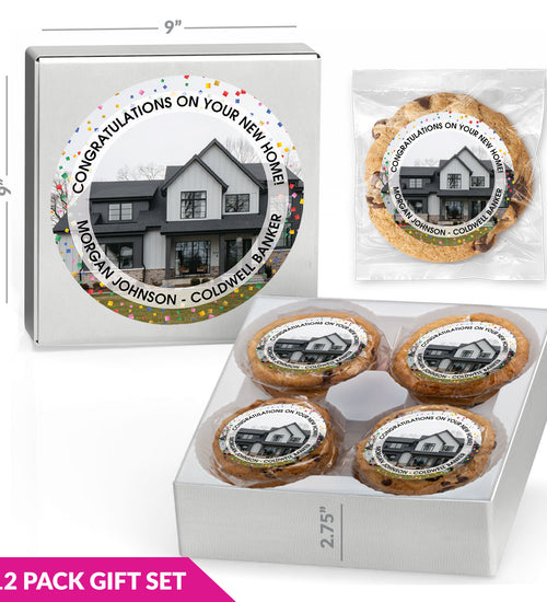 Enjoy 12 individually wrapped gourmet cookies—freshly baked with premium ingredients. Choose Chocolate Chip or a Variety Pack, each cookie personalized with your full-color sticker and matching gift box label.