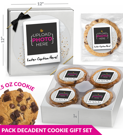Enjoy 8 freshly baked 4.5 oz. Custom Decadent Cookies in six irresistible flavors—Triple Chocolate, S’more, Reese’s Peanut Butter Chunk, Red Velvet, Chocolate Chunk, and Salted Caramel. Each cookie and gift box feature your full-color personalized sticker, sealed for freshness.