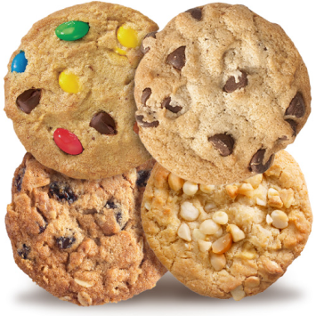 Treat yourself to the best of all worlds with our Variety Pack of cookies! Delight in the rich Chocolate Chip, the exotic Macadamia Nut, the classic Oatmeal Raisin, and the fun M&M Chocolate Chip.