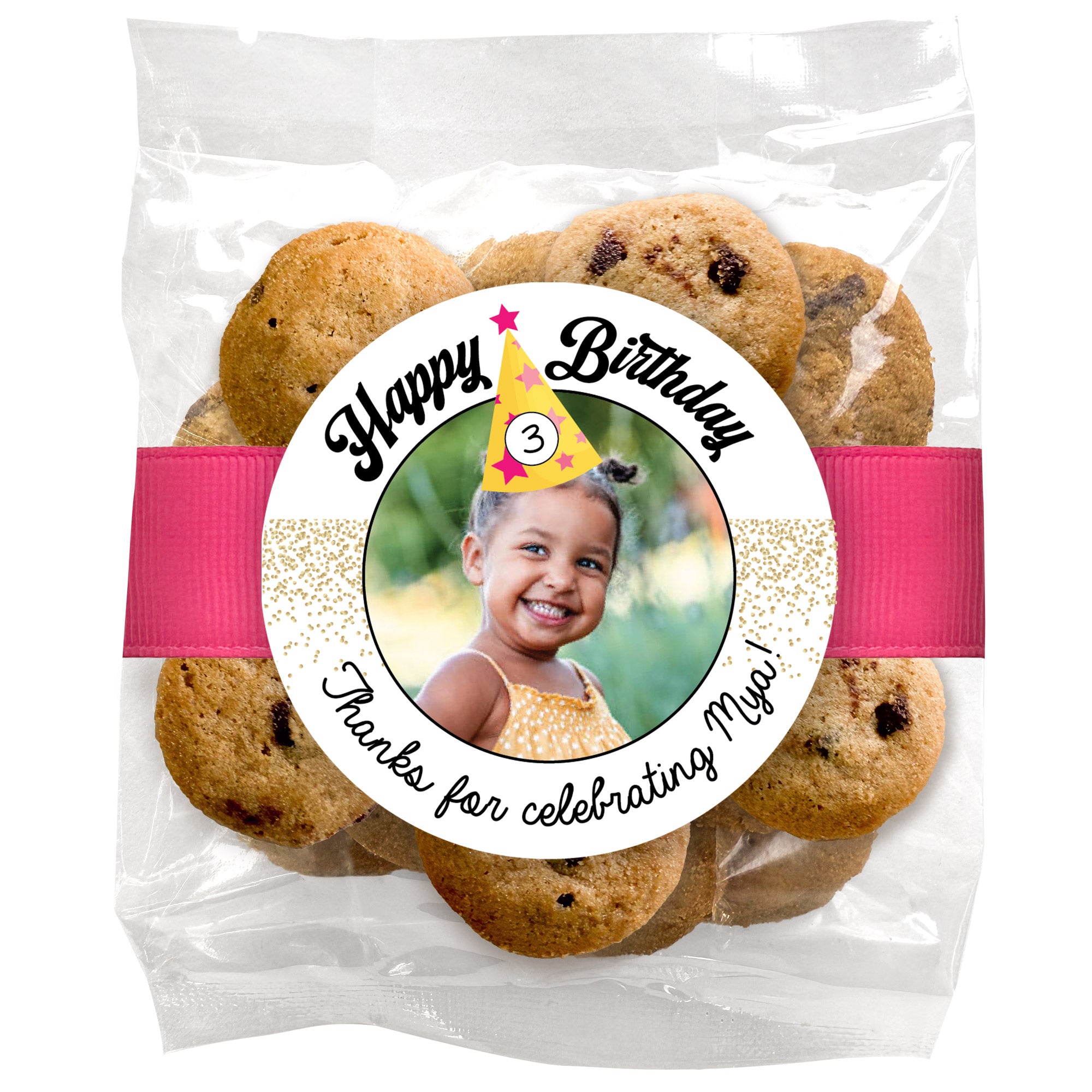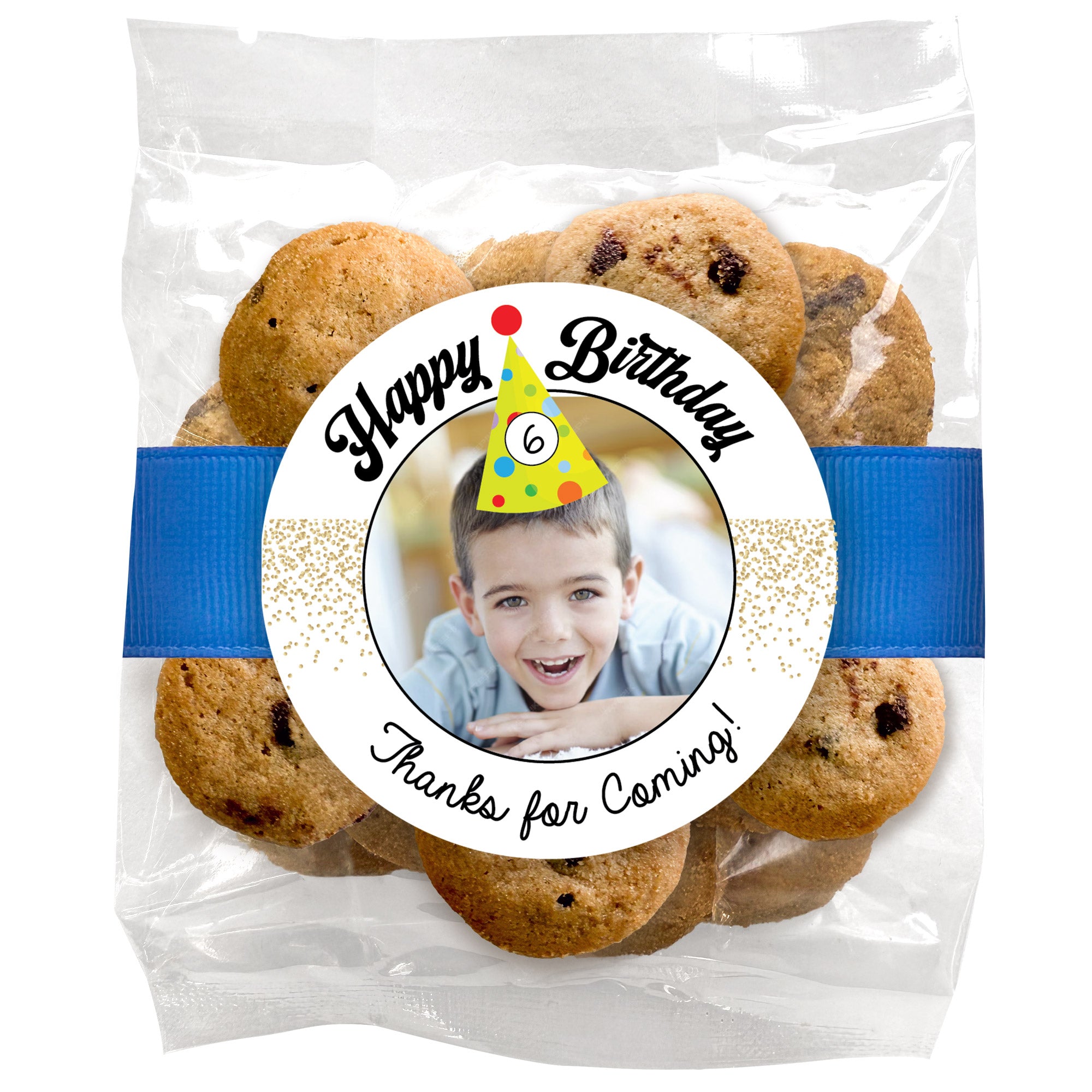 Birthday Party Hat & Photo upload - Chocolate Chip Mini Cookies (2 oz) W/ Full Color Custom Sticker & Ribbon