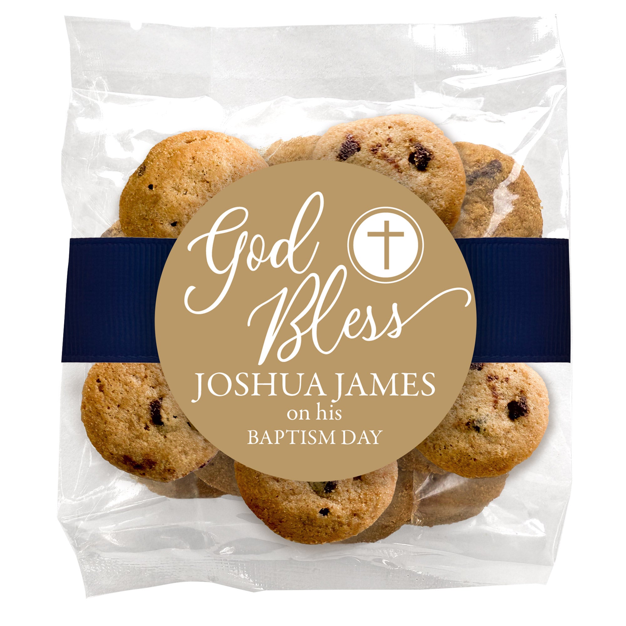 Bite-Sized Chocolate Chip Cookies (2 oz., approx. 16 cookies) W/ Full Color Custom Sticker & Ribbon - God Bless Simple Cross