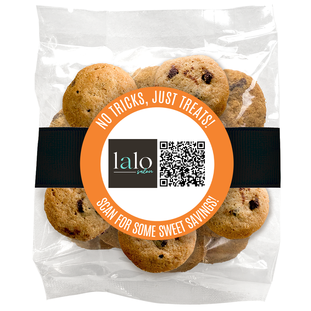 Tradeshow QR CODE Upload & Message - Bite-Sized Chocolate Chip Cookies (2 oz., approx. 14 cookies) W/ Full Color Custom Sticker & Ribbon