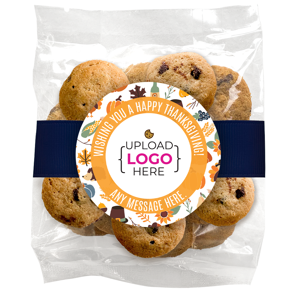 Bite-Sized Chocolate Chip Cookies (2 oz., approx. 14 cookies) W/ Full Color Custom Sticker & Ribbon - Happy Thanksgiving Logo Upload