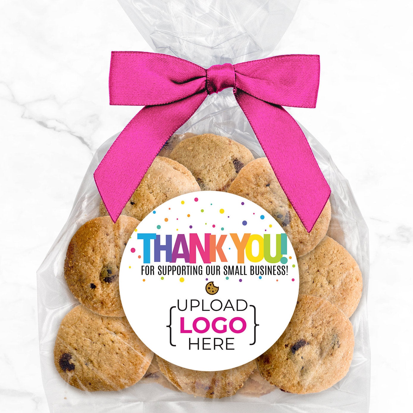 Colorful Thank You Logo Upload - Bite-Sized Chocolate Chip Cookies (3 oz., approx. 24 cookies) W/ Full Color Custom Sticker & Bow
