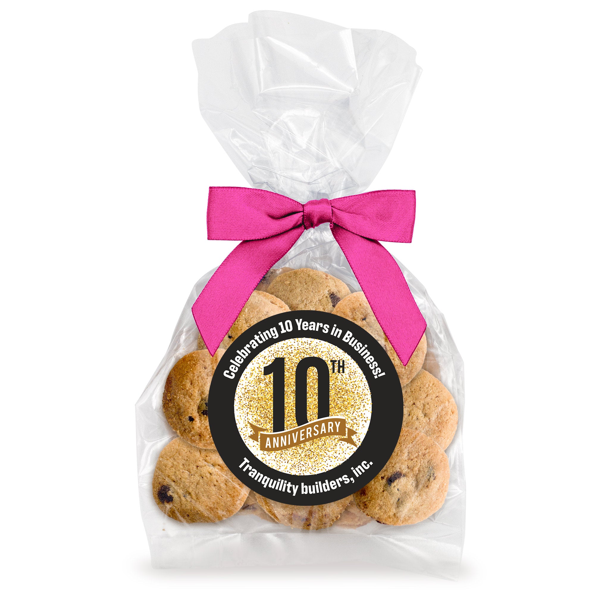 Celebrating "X" Years in Business - Bite-Sized Chocolate Chip Cookies (3 oz., approx. 24 cookies) W/ Full Color Custom Sticker & Bow Choice