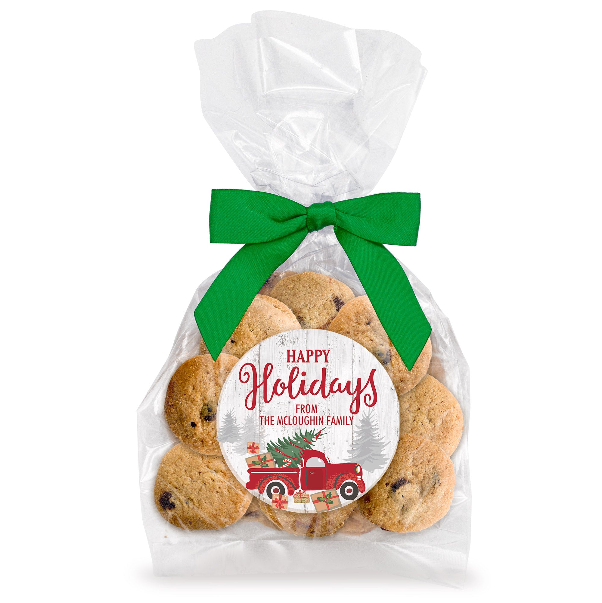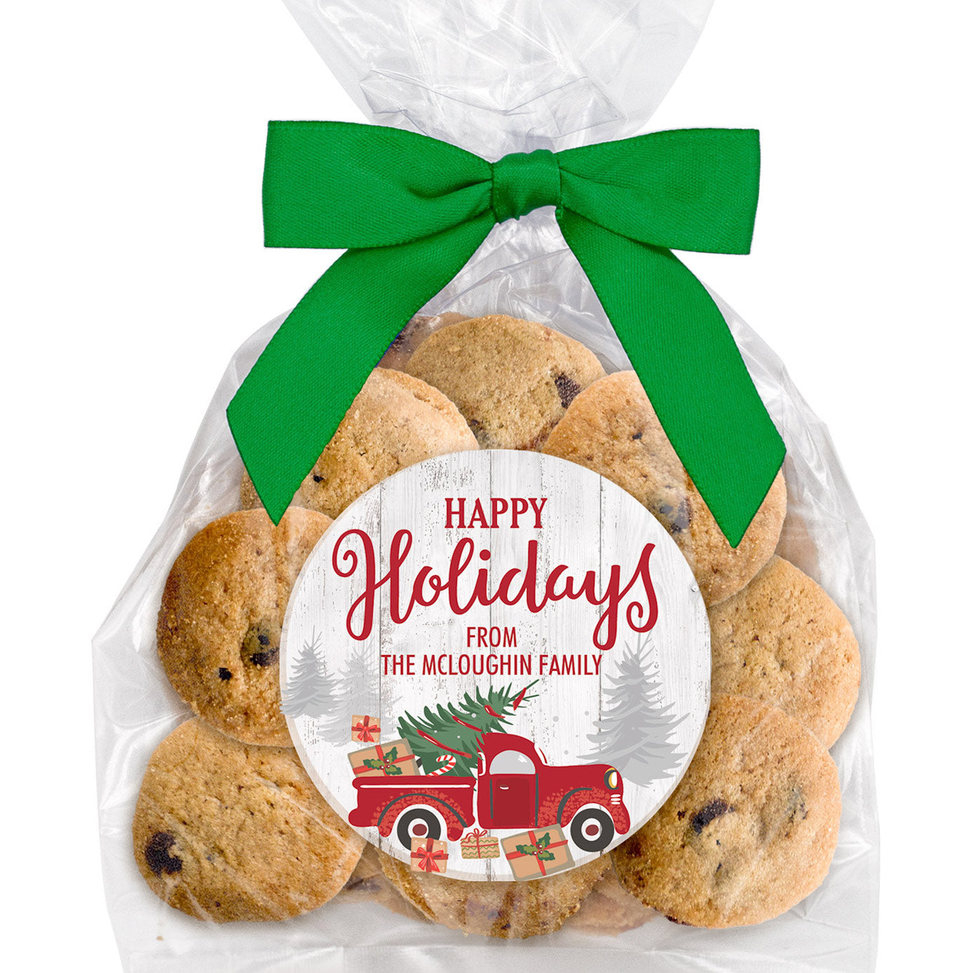 Happy Holidays Red Truck - Bite-Sized Chocolate Chip Cookies (3 oz., approx. 24 cookies) W/ Full Color Custom Sticker & Bow Choice