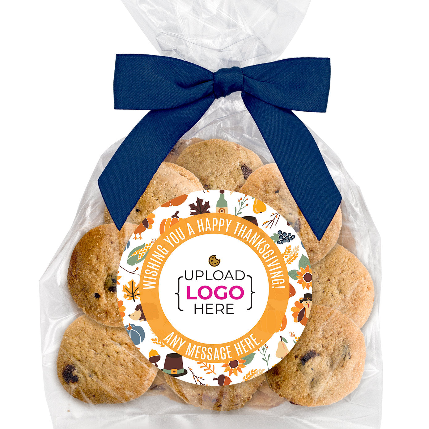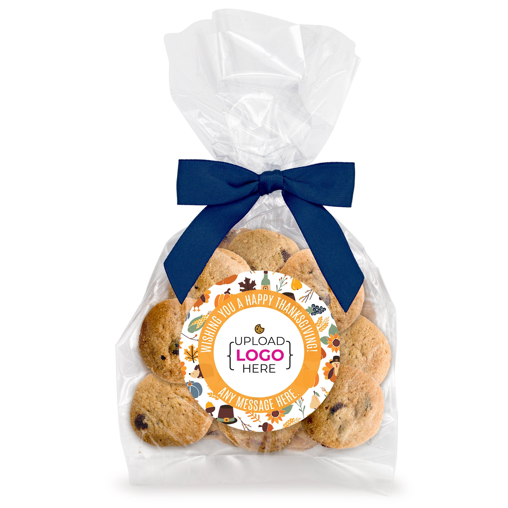 Bite-Sized Chocolate Chip Cookies (3 oz., approx. 24 cookies) W/ Full Color Custom Sticker & Bow Choice - Happy Thanksgiving Logo Upload