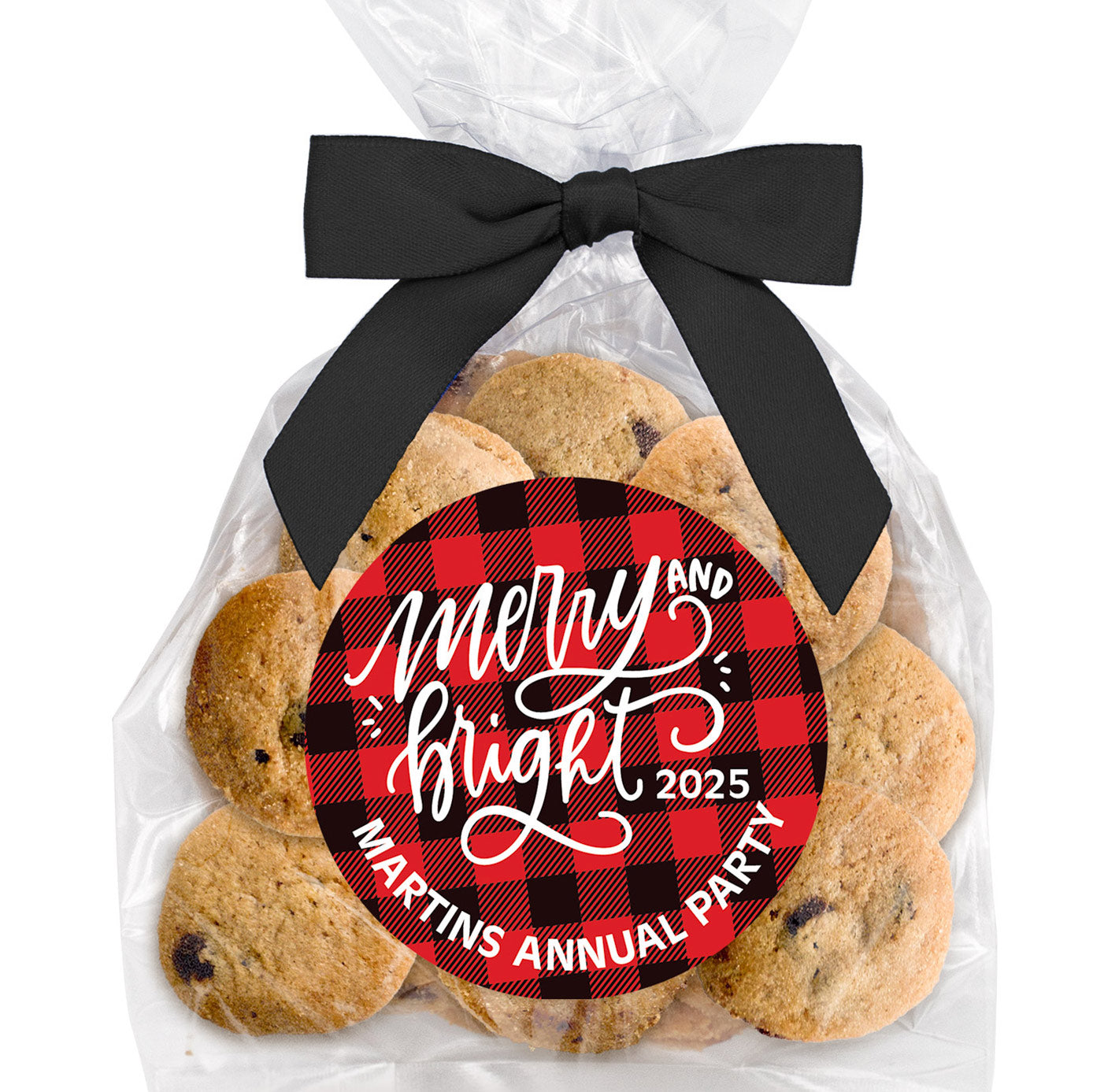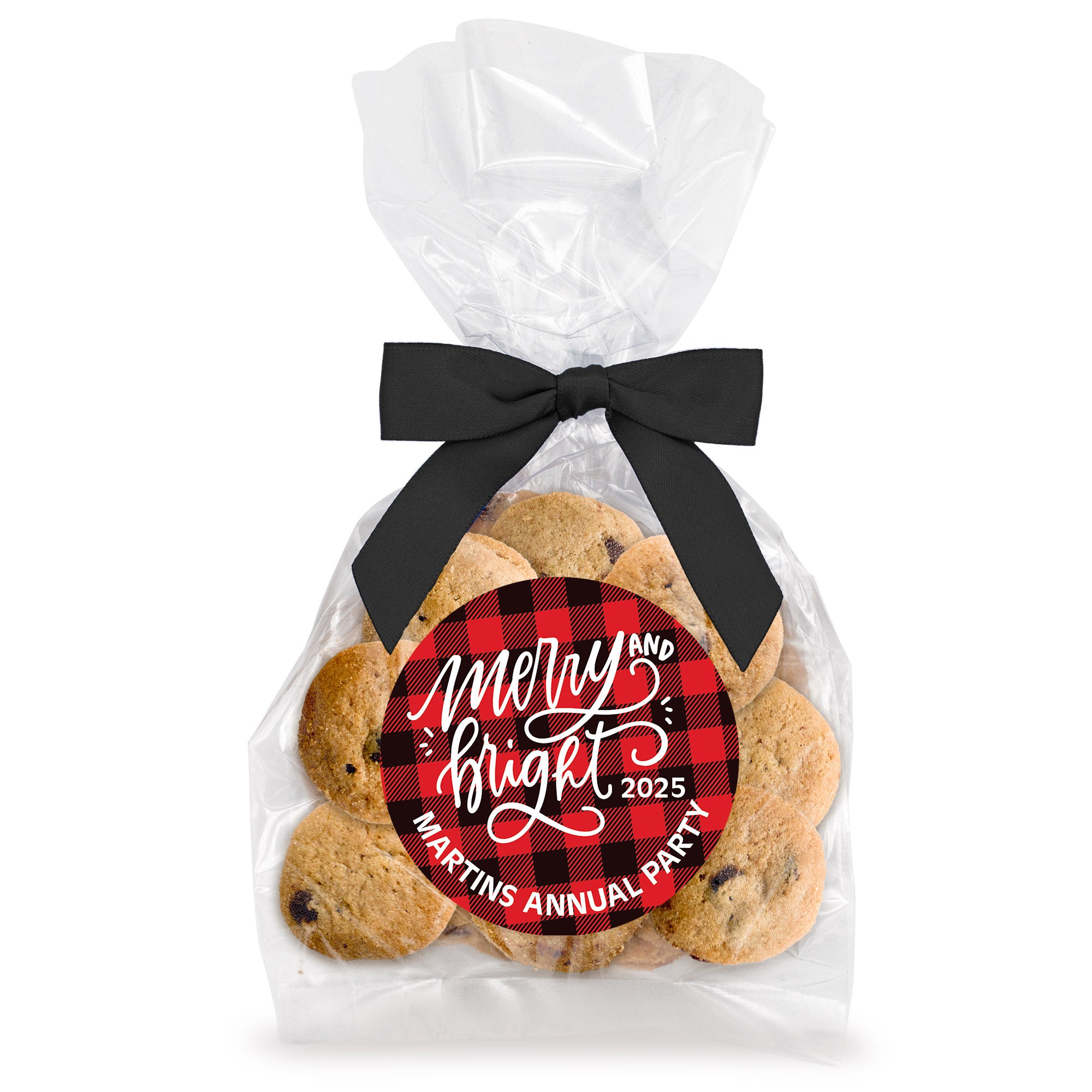 Merry & Bright - Bite-Sized Chocolate Chip Cookies (3 oz., approx. 24 cookies) W/ Full Color Custom Sticker & Bow Choice