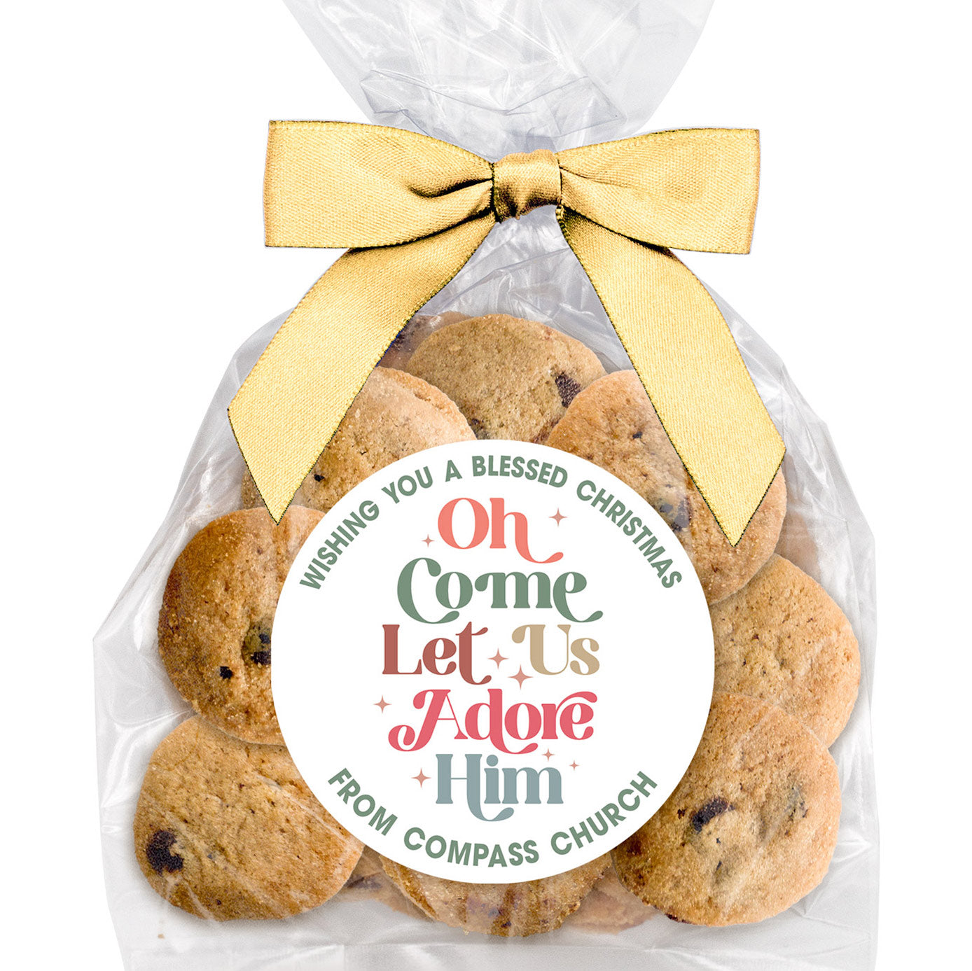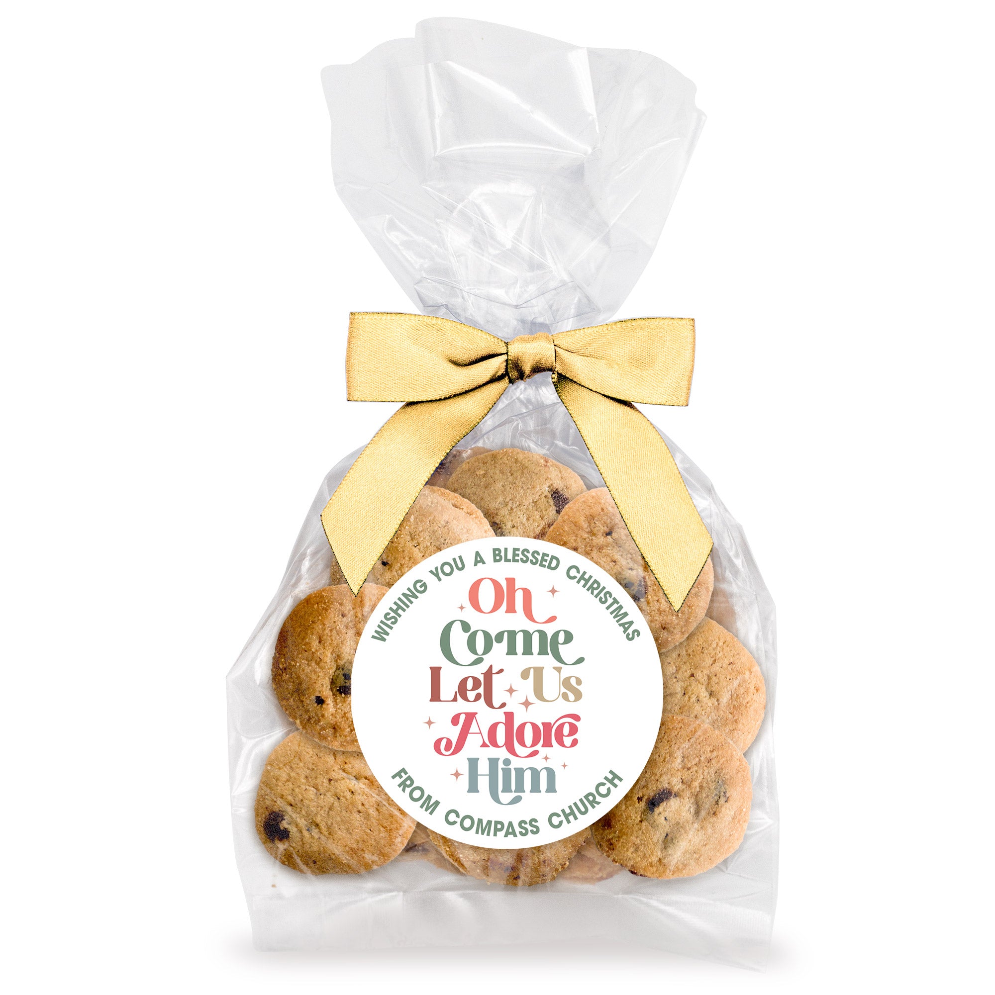 Oh Come let us Adore You - Bite-Sized Chocolate Chip Cookies (3 oz., approx. 24 cookies) W/ Full Color Custom Sticker & Bow Choice