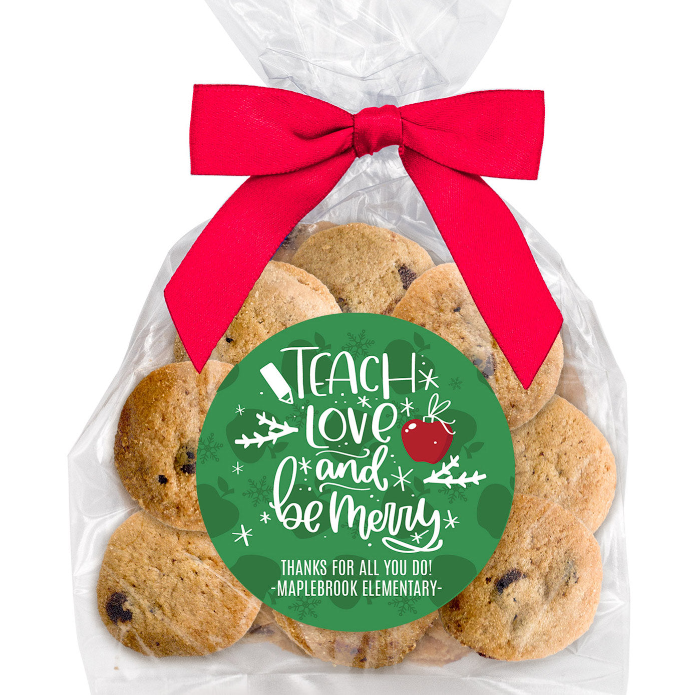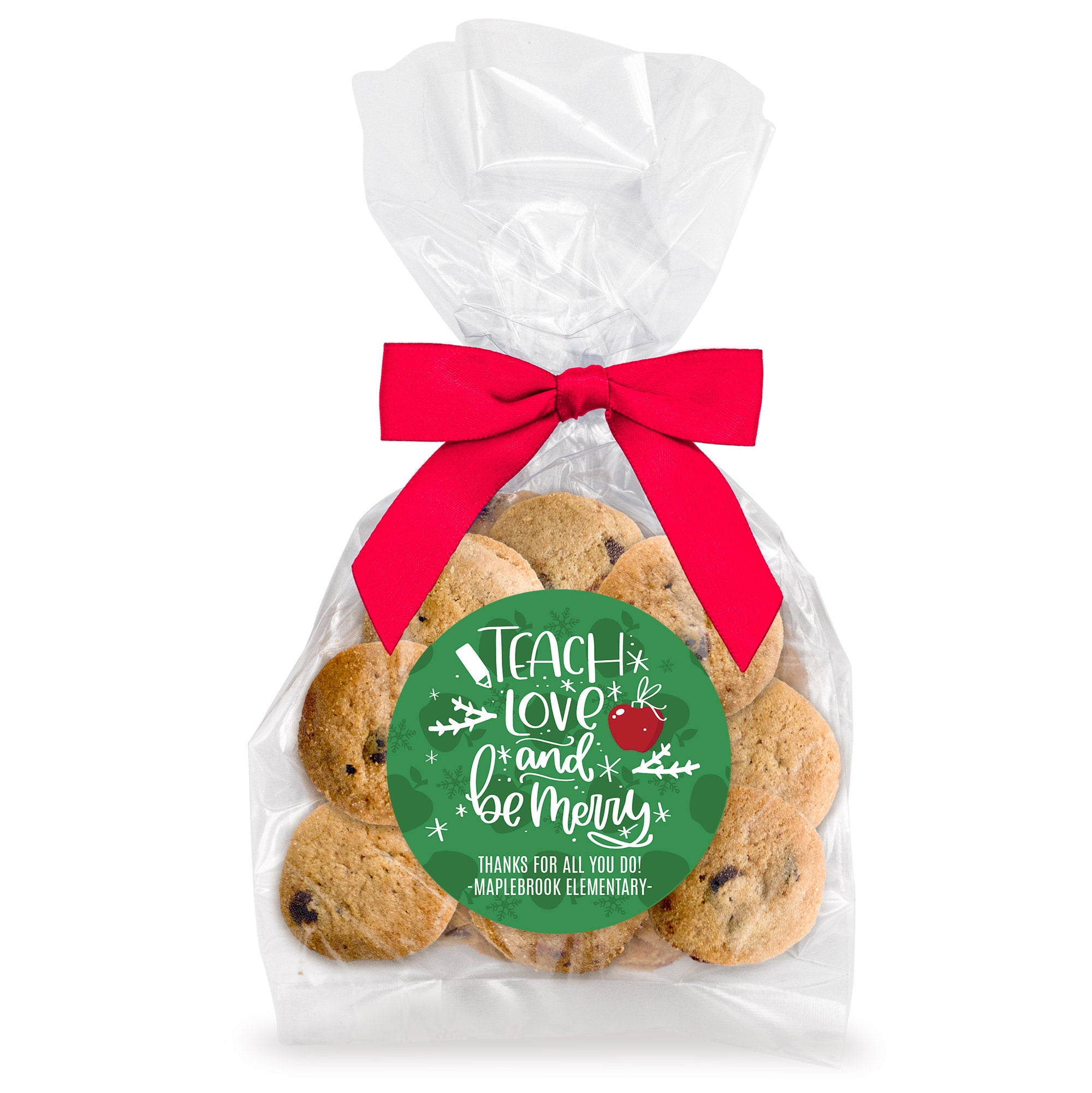 Teach, Love & Be Merry Christmas - Bite-Sized Chocolate Chip Cookies (3 oz., approx. 24 cookies) W/ Full Color Custom Sticker & Bow Choice