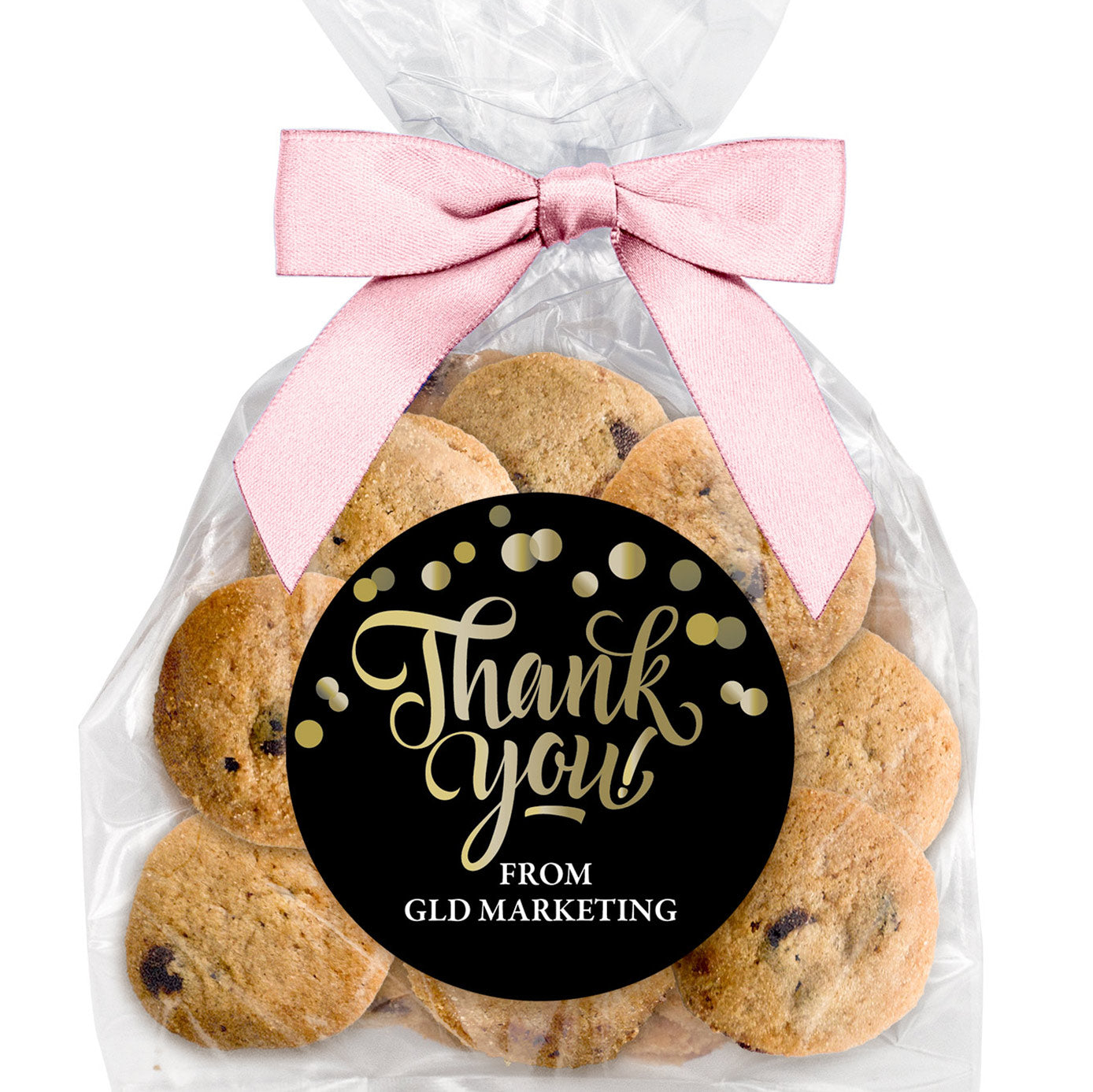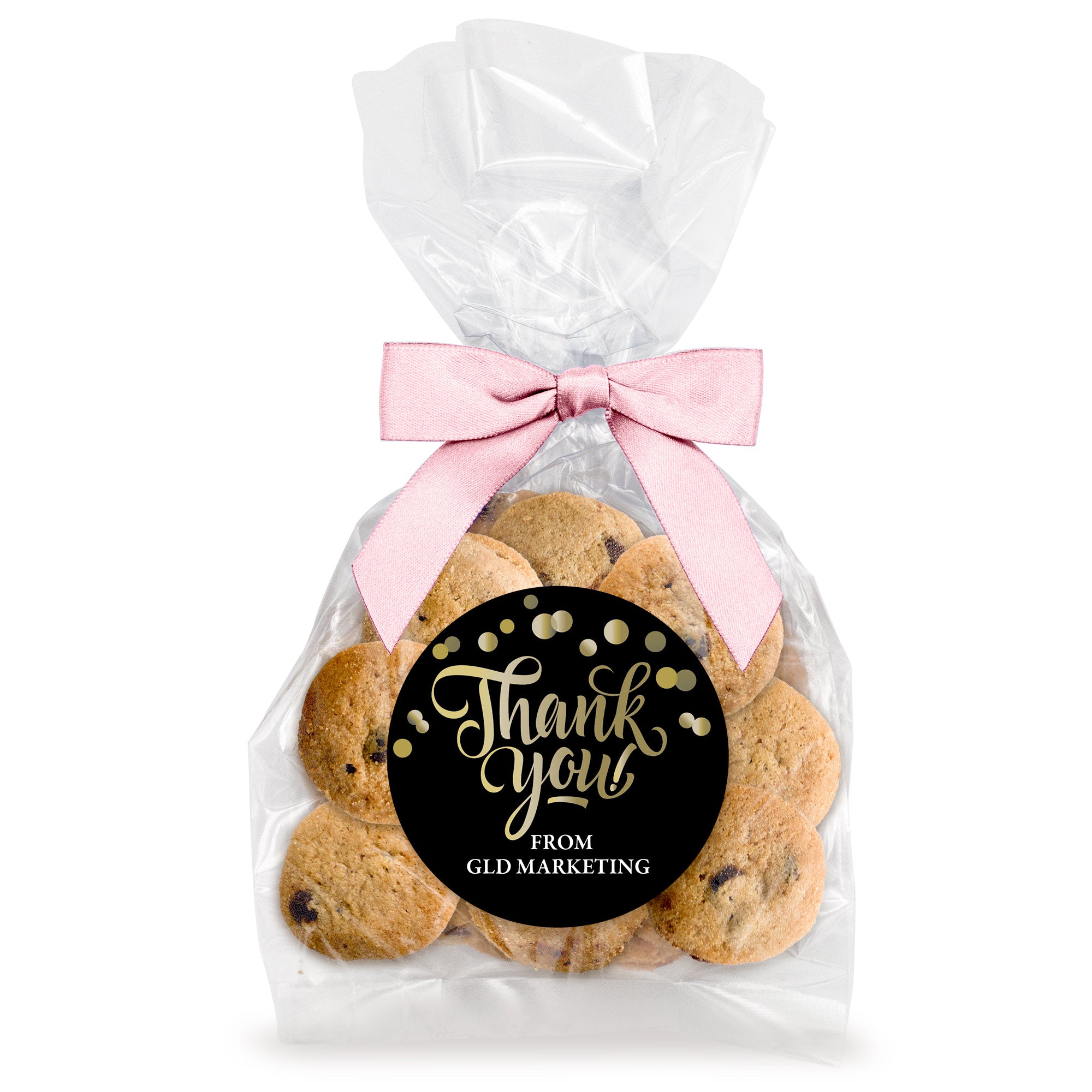 Thank You Gold and Black - Bite-Sized Chocolate Chip Cookies (3 oz., approx. 24 cookies) W/ Full Color Custom Sticker & Bow Choice
