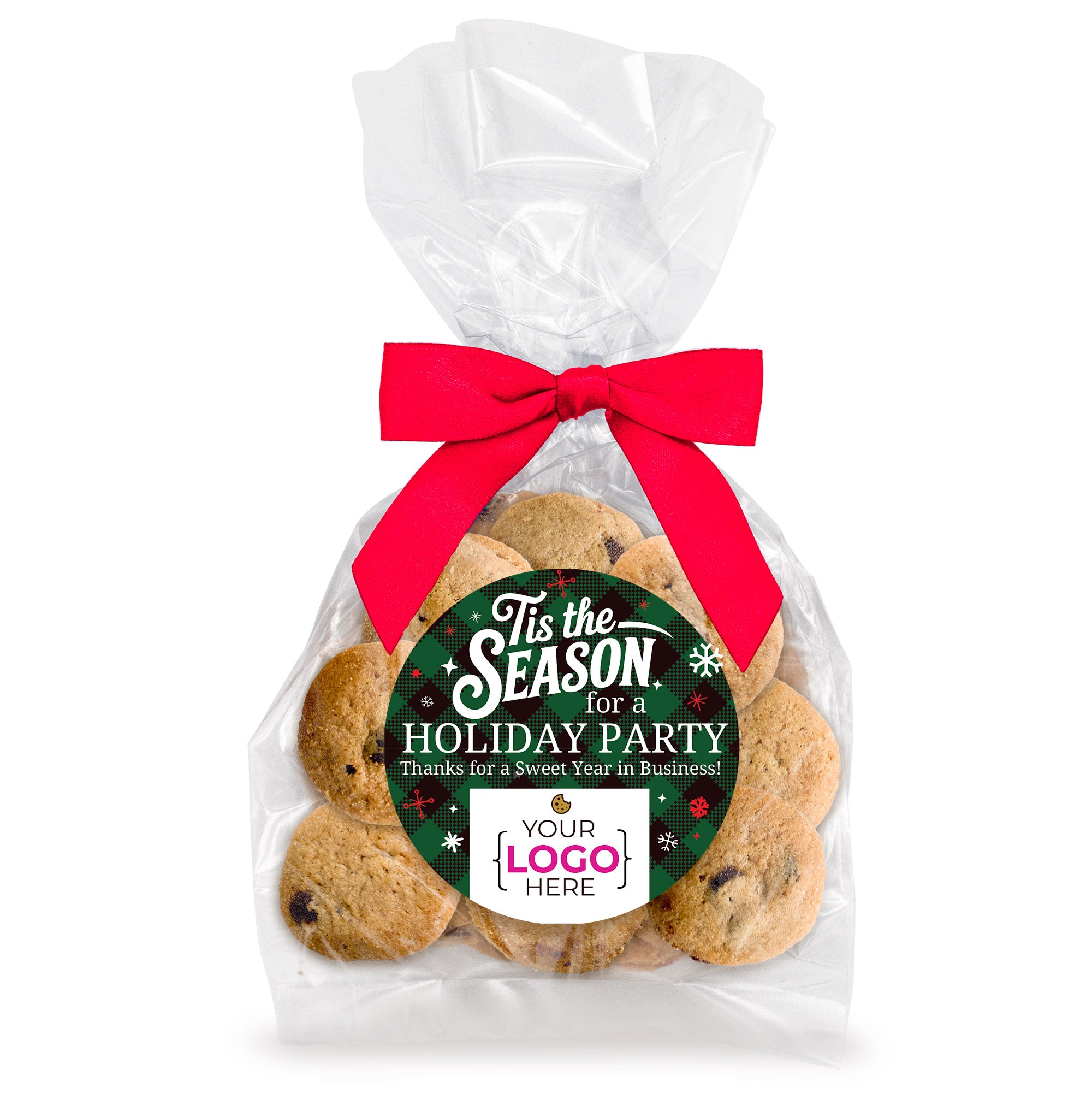 Bite-Sized Chocolate Chip Cookies (3 oz., approx. 24 cookies) W/ Full Color Custom Sticker & Bow Choice - Tis' the Season for a Holiday Party Logo Upload