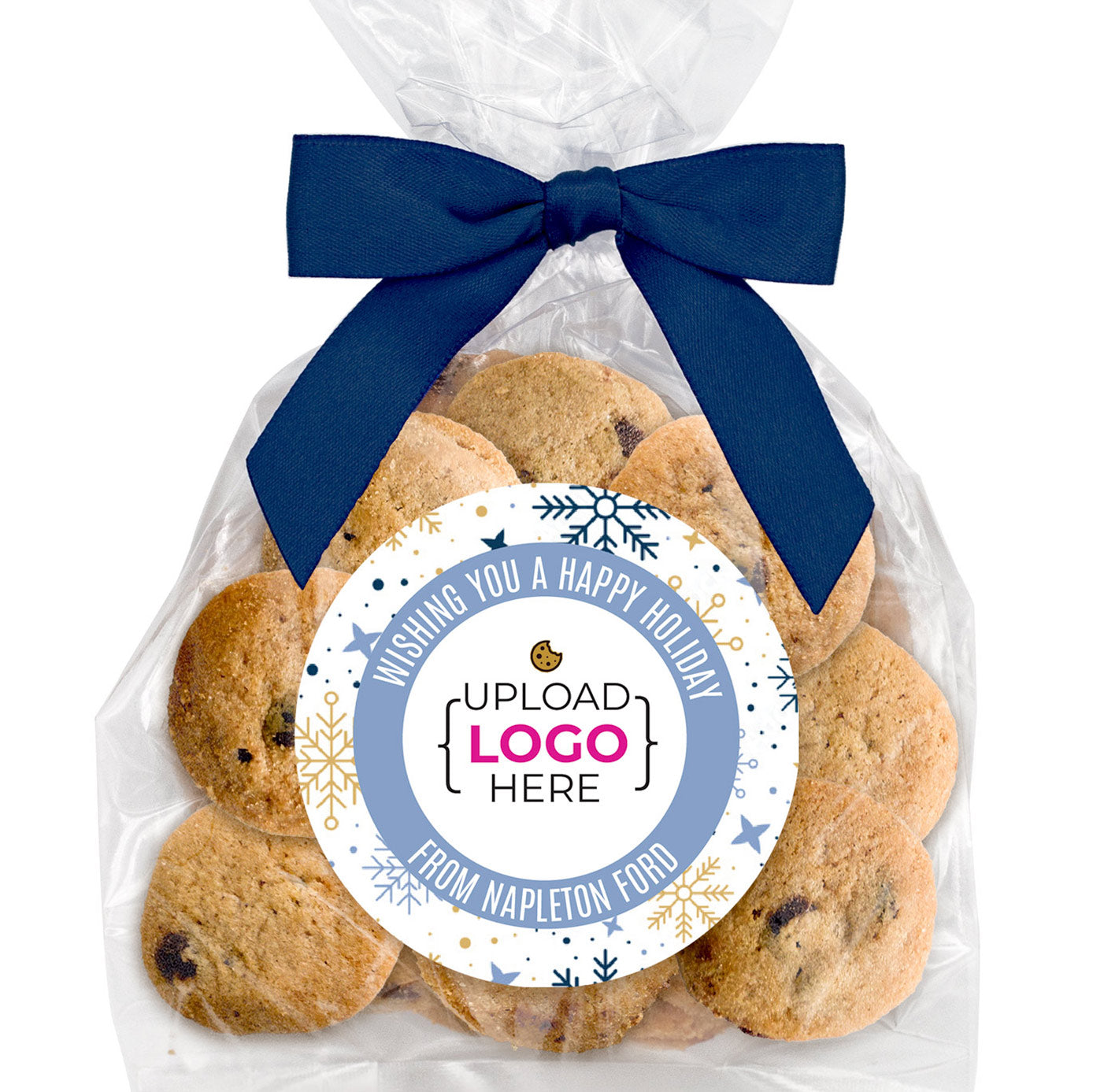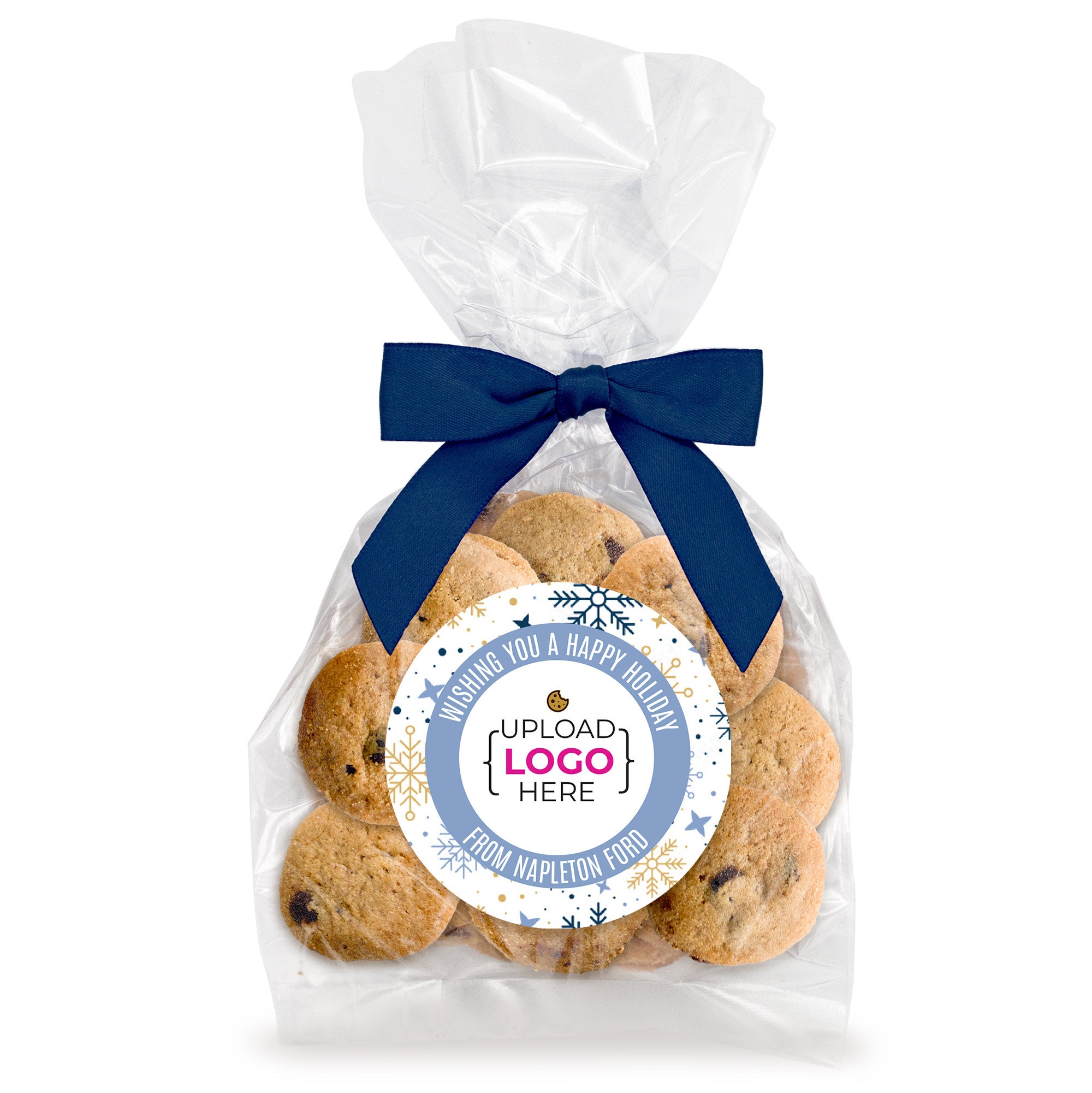 Bite-Sized Chocolate Chip Cookies (3 oz., approx. 24 cookies) W/ Full Color Custom Sticker & Bow Choice - Happy Holidays Logo Upload