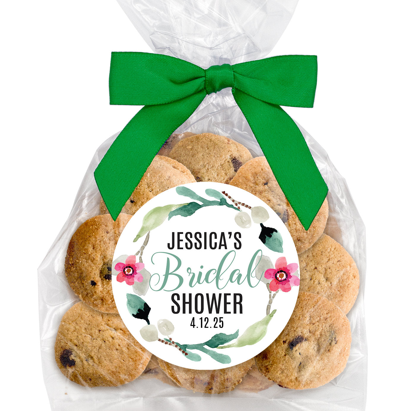Floral Wreath Bridal Shower - Bite-Sized Chocolate Chip Cookies (3 oz., approx. 24 cookies) W/ Full Color Custom Sticker & Bow