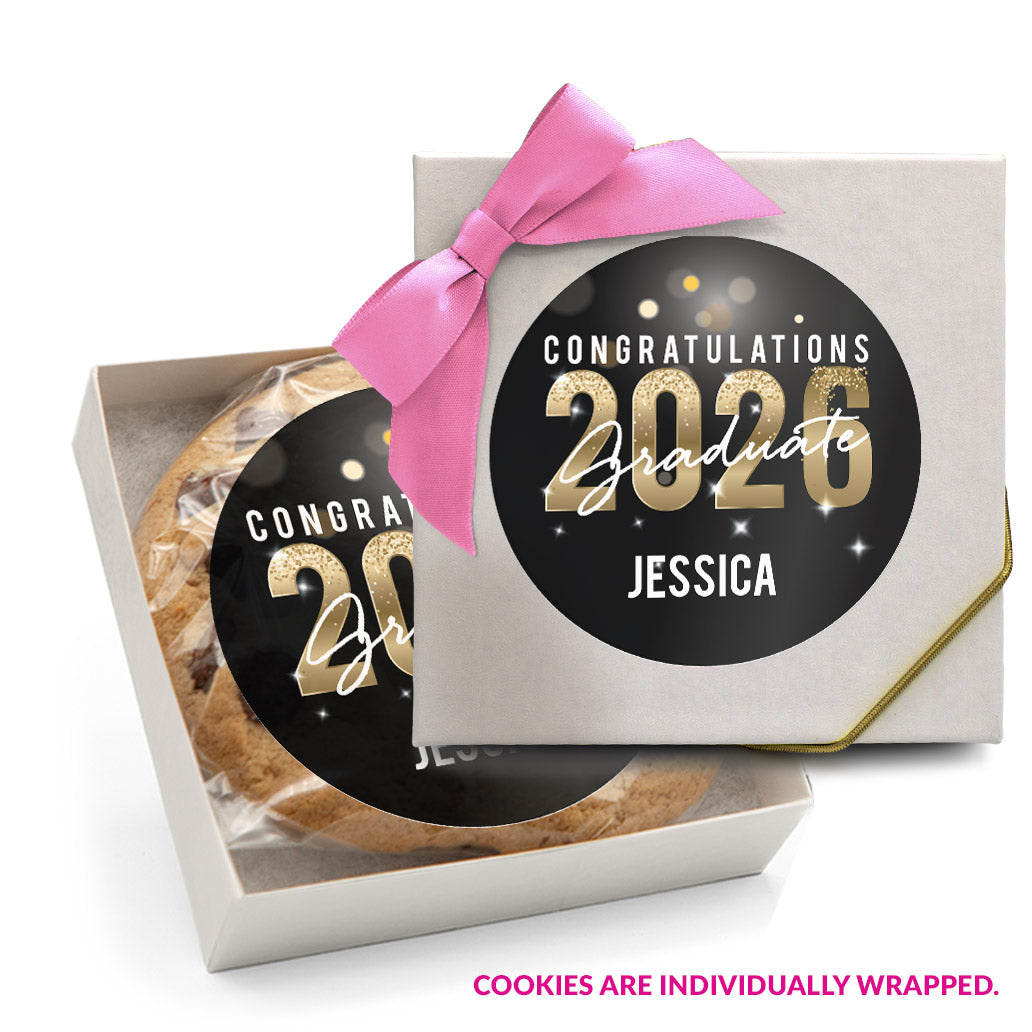 Gold Sparkle Congrats - Personalized Direct Print On Round Sugar Cookie w/ Matching Personalized Favor Box, Sticker & Bow Choice