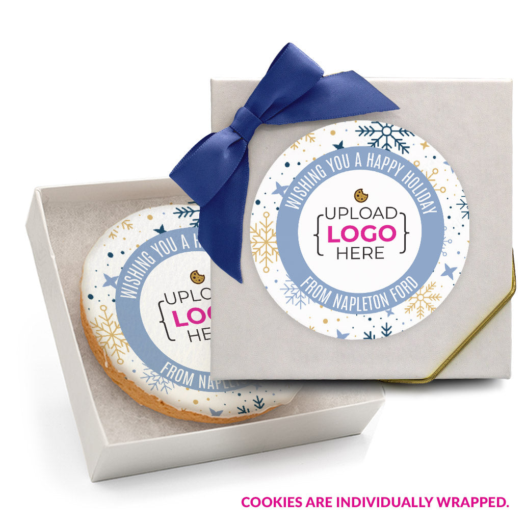 Happy Holidays Logo Upload - Gourmet Chocolate Chip Or Variety Pack W/ Full Color Personalized Sticker, Favor Box & Bow Choice