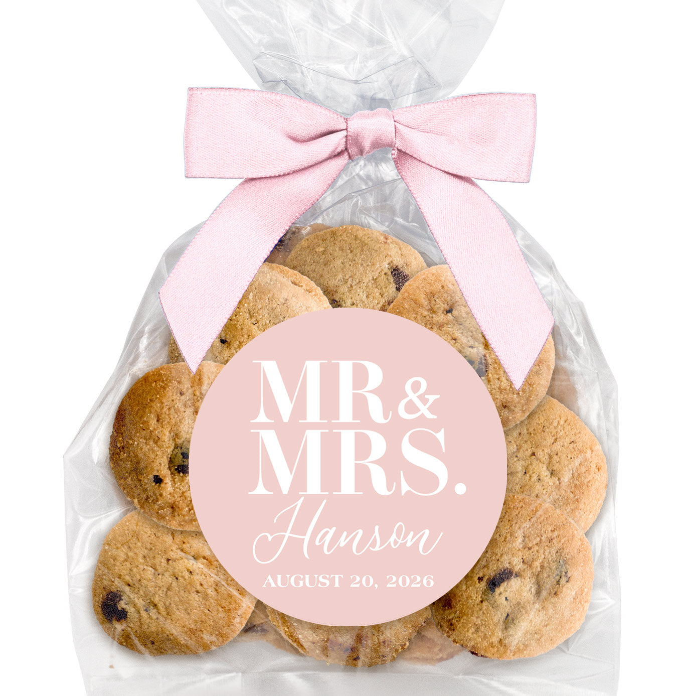 Mr. & Mrs. - Bite-Sized Chocolate Chip Cookies (3 oz., approx. 24 cookies) W/ Full Color Custom Sticker & Bow