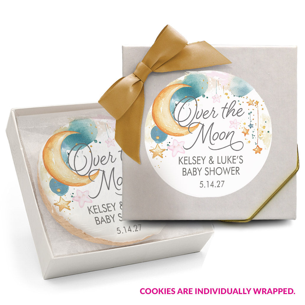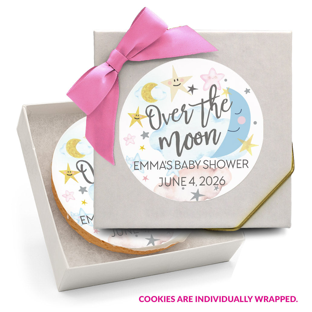 Over the Moon Baby Shower - Gourmet Chocolate Chip Or Variety Pack W/ Full Color Personalized Sticker, Favor Box & Bow Choice