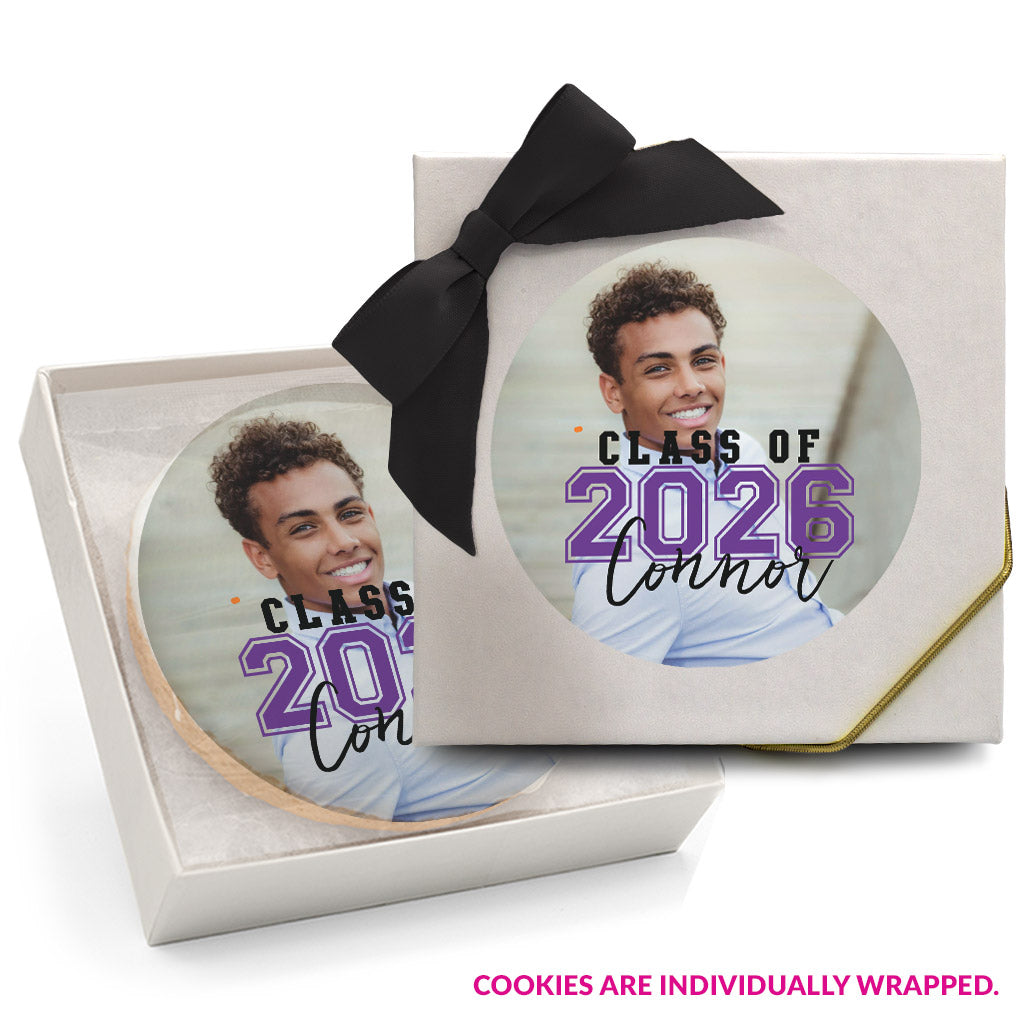 Overlay Photo Grad Cookie - Personalized Direct Print On Round Sugar Cookie w/ Matching Personalized Favor Box, Sticker & Bow Choice