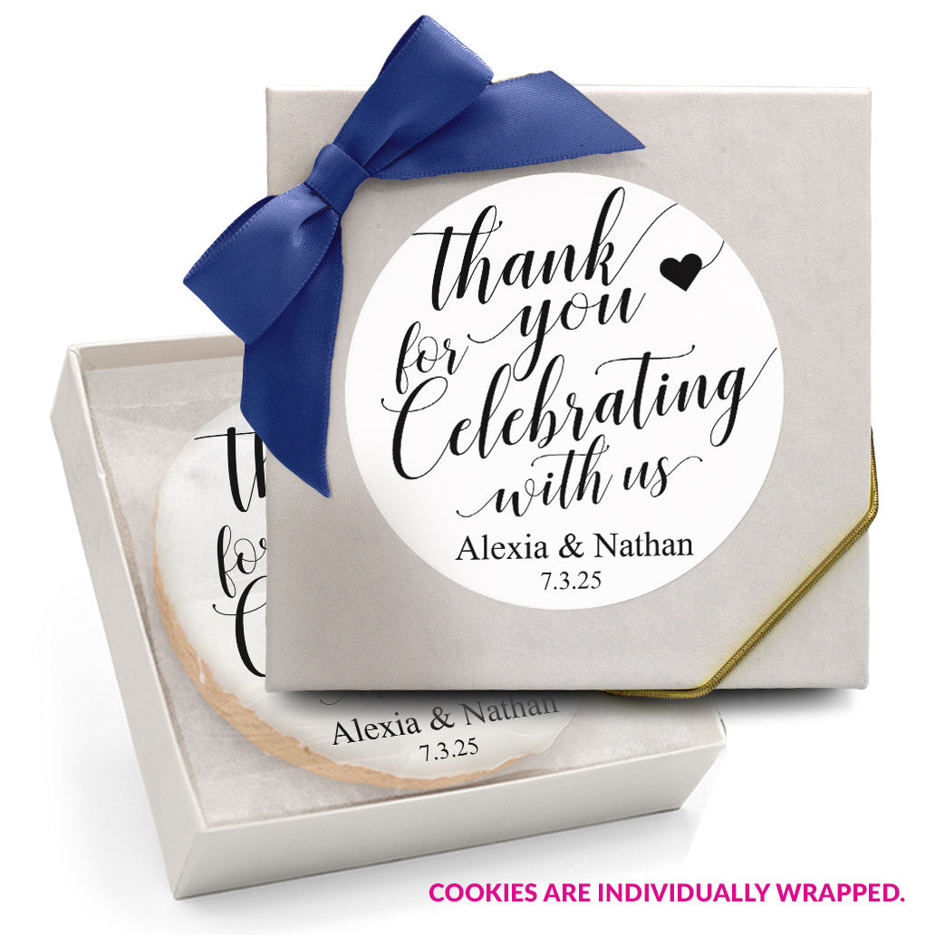 Thank You For Celebrating With Us - Personalized Direct Print On Round Sugar Cookie w/ Matching Personalized Favor Box, Sticker & Bow Choice